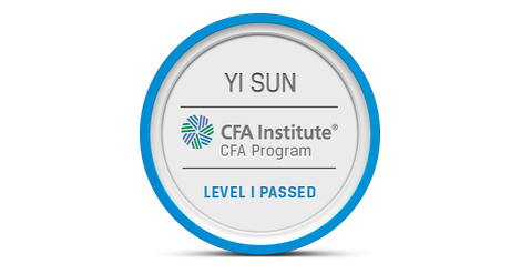 The owner of this badge has passed Level I of the CFA Program. By passing all three of the CFA Program exams and gaining relevant industry experience, candidates demonstrate their mastery of the ethical, analytical, and decision-making skills most needed in the global investment management profession. The CFA credential is the most respected and recognized investment designation in the world with more than 150,000 charterholders globally.