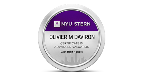 The NYU Stern Certificate in Valuation teaches students how to understand and apply the core fundamentals of valuation whether it’s preparing for an imminent merger or acquisition, or marveling over the latest dollar figure attached to a tech wunderkind. The Valuation course unfolds over 15 weeks, with two new topics released each week. Roughly every other week, Professor Damodaran will hold a live online Q&A session for all participants in the course. Students will complete three quizzes, a final valuation project, and a final exam. Successful completion of the course results in an NYU Stern Certificate in Advanced Valuation.